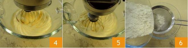 jusqu'à obtenir un mélange blanc et mousseux 4; si vous n'avez pas de batteur, vous pouvez utiliser un fouet électrique. Versez l'huile végétale en filet pendant que le batteur est en marche 5. Dans un autre bol, tamisez la farine, la fécule de pomme de terre et la levure 6 et mélangez-les ensemble.