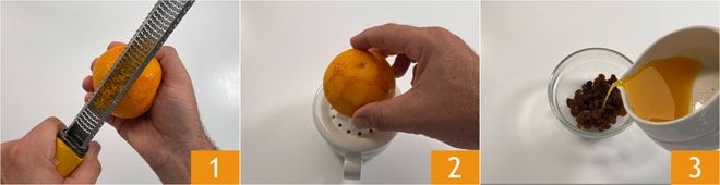 Pour préparer la couronne aux fruits secs et caramel, commencez par râper le zeste d'une orange 1 puis en extrayez le jus 2. Dans un petit bol, mettez les raisins secs et ajoutez le jus d'orange 3. Laissez-les tremper jusqu'au moment de l'utilisation.