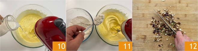 Faites de même pour le lait 10. Incorporez, deux cuillères à soupe à la fois, également les poudres 11. Hachez les fruits secs au couteau 12.
