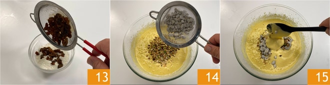 Égouttez les raisins secs et enfarinez-les 13. Ajoutez à la pâte les fruits secs et les raisins secs 14. Mélangez de bas en haut pour ne pas faire retomber la pâte 15.