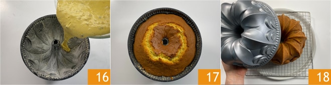 Versez-la dans un moule de 24 cm de diamètre 16, préalablement beurré et fariné. Cuisez au four statique, préchauffé, à 180°C pendant 50-60 minutes 17. Laissez refroidir puis démoulez, en la retournant sur une grille 18.