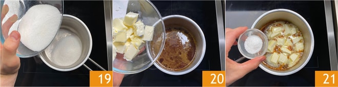 Maintenant, concentrez-vous sur la préparation du caramel. Dans une petite casserole, mettez le sucre 19 et faites cuire à feu moyen. Lorsqu'il sera fondu et aura atteint la couleur typique du caramel, ajoutez le beurre 20, le sel 21 et mélangez.