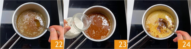 Une fois le beurre fondu 22, baissez le feu, ajoutez la crème chaude 23 et en étant très prudent, mélangez 24. Éteignez le feu et transférez le caramel dans un bol adapté aux hautes températures.
