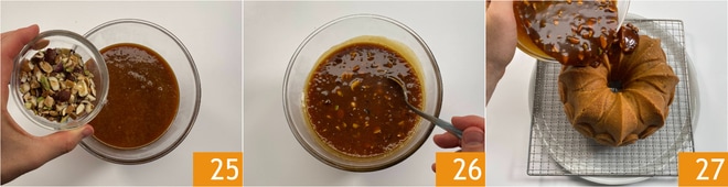 Ajoutez les fruits secs concassés au caramel 25, mélangez 26 et laissez refroidir à température ambiante. Versez-le sur le couronne 27. Votre couronne aux fruits secs et caramel est prête à être dégustée.