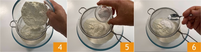 Tamisez la farine 4, la levure chimique 5, le bicarbonate de soude 6 et réservez.