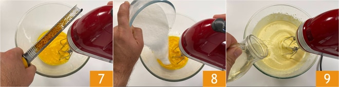 Dans un bol, cassez les œufs, ajoutez le zeste d'orange prélevé précédemment 7 et commencez à travailler avec les fouets électriques. Vous pouvez également effectuer ces opérations avec un batteur sur socle. Ajoutez le sucre 8 et battez pendant 10-15 minutes. Lorsque le mélange sera bien gonflé, réduisez la vitesse des fouets et versez l'huile de graines en filet 9.
