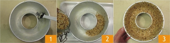 Pour réaliser la couronne aux noisettes, commencez par beurrer un moule à couronne de 20 cm de diamètre 1, puis versez les éclats de noisettes 2 afin de recouvrir à la fois le fond et les côtés 3.