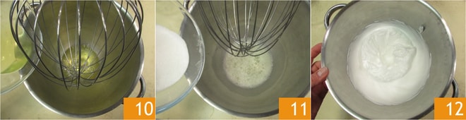 Réservez le mélange de jaunes d'œufs et versez les blancs dans le bol d'un robot pâtissier muni d'un fouet 10. Commencez à fouetter, puis ajoutez 120 g de sucre en continuant de fouetter 11. Vous devez obtenir une consistance assez crémeuse 12.