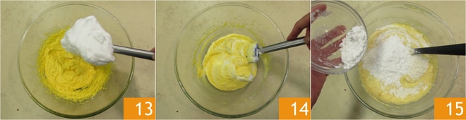 Incorporez les blancs en neige dans le mélange de jaunes d'œufs 13, en mélangeant délicatement avec une maryse 14. Commencez par ajouter un tiers des blancs en neige, puis le reste. Ajoutez la farine et la fécule 15 et mélangez à nouveau.
