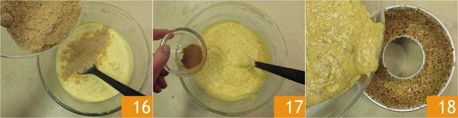 Enfin, incorporez la farine de noisettes 16 et la cannelle 17. Versez la pâte obtenue dans le moule à couronne beurré et recouvert de noisettes 18, puis frappez-le délicatement sur le plan de travail.