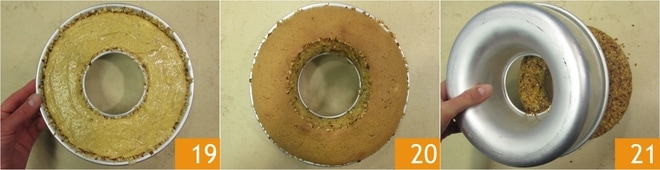 Faites cuire au four statique préchauffé à 170° pendant environ 40 minutes 19. Vérifiez la cuisson avec un cure-dent, puis sortez du four et laissez refroidir complètement dans le moule 20 avant de renverser la couronne sur un plat de service 21.