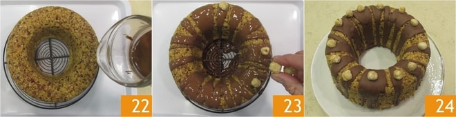 Garnissez la couronne de chocolat gianduja fondu 22 et complétez avec des noisettes entières grillées 23. Votre couronne aux noisettes est prête à être dégustée 24 !