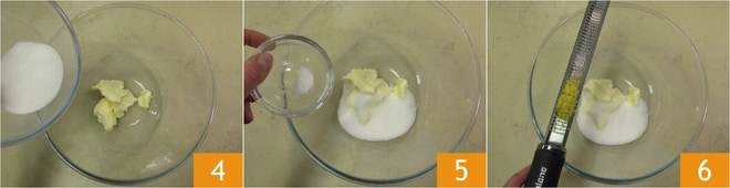 Réservez le moule et préparez la pâte : commencez par séparer les blancs des jaunes d'œufs. Mettez le beurre ramolli et 55 g de sucre dans un bol 4, ajoutez le sel 5 et le zeste de citron râpé 6. Travaillez avec un batteur électrique pour obtenir une crème.
