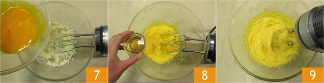À ce stade, ajoutez les jaunes d'œufs 7 et le brandy 8, en continuant de mélanger avec le batteur jusqu'à obtenir un mélange lisse et homogène 9.