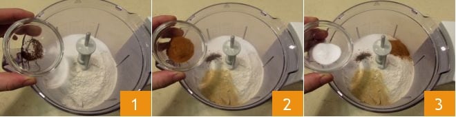 Pour préparer le pain d'épices, mettez dans le bol d'un mixeur la farine, les clous de girofle en poudre 1, le gingembre en poudre et la cannelle en poudre 2, le bicarbonate 3