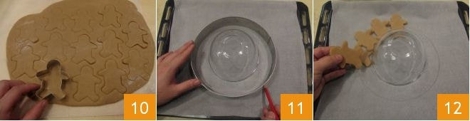 Après le temps nécessaire, sortez la pâte du réfrigérateur et étalez-la en un disque de 1 cm d'épaisseur. Découpez environ 30 biscuits avec les emporte-pièces, qui serviront à réaliser 2 couronnes de pain d'épices (vous pouvez pétrir rapidement et réétaler les chutes pour terminer la pâte). Pour créer un cercle parfait pour votre couronne, placez au centre de la plaque recouverte de papier sulfurisé un bol retourné et dessinez autour un cercle. Disposez les biscuits tout autour, en les chevauchant légèrement : un ruban devra passer entre chaque biscuit et il en faudra 15 pour chaque couronne de pain d'épices 12.