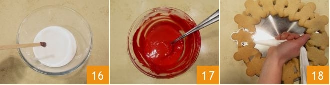 jusqu'à obtenir une consistance fluide. Ensuite, transférez la moitié du glaçage dans un petit bol et ajoutez le colorant jusqu'à obtenir un rouge vif (16-17). Transférez les deux glaçages dans deux poches à douille jetables sans embout auxquelles vous pouvez faire un petit trou à la pointe. Décorez le contour des petits biscuits maintenant froids 18