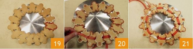 en alternant les deux glaçages 19, puis insérez un ruban entre chaque biscuit et faites-le passer entre les biscuits de manière à ce qu'il soit visible 20 et effectuez les mêmes opérations pour l'autre couronne de pain d'épices, ainsi elles seront prêtes à être utilisées 21.