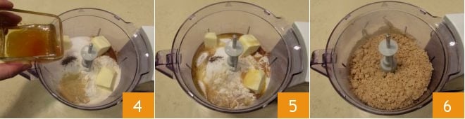 le sucre et une pincée de sel. Ajoutez ensuite la noix de muscade râpée, le beurre froid du réfrigérateur en morceaux et le miel 4. Une fois que vous avez complété tous les ingrédients 5, actionnez les lames par intermittence pour ne pas trop chauffer la pâte et créez une texture sableuse 6.