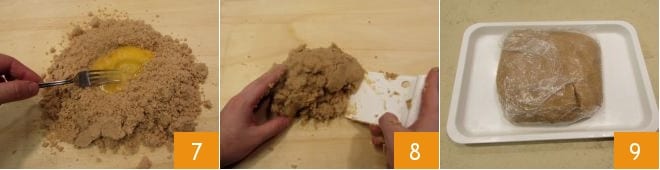 Renversez-le sur un plan de travail et formez une fontaine, puis ajoutez l'œuf 7 et mélangez d'abord avec la fourchette puis à la main rapidement pour ne pas trop chauffer la pâte. Ramassez-la 8 et formez une boule, aplatissez-la légèrement et enveloppez-la dans du film alimentaire 9. Laissez reposer au réfrigérateur pendant au moins 30 minutes.