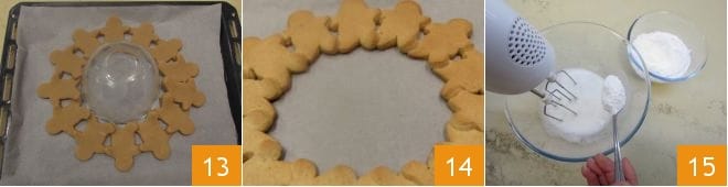 Faites cuire les biscuits 13 dans un four statique préchauffé à 170° pendant 15 minutes (si ventilé à 150° pendant environ 8-10 minutes). Lorsqu'ils sont cuits, sortez-les du four et laissez-les tiédir 14 puis démoulez-les sur une grille pour les laisser refroidir complètement. Pendant ce temps, préparez le glaçage : battez le blanc d'œuf avec un batteur électrique, puis ajoutez petit à petit le sucre glace 15.