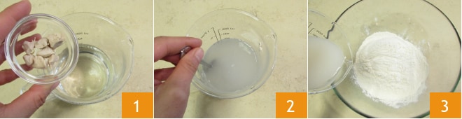 Pour préparer le beignet pizza haut et moelleux, nous avons choisi de tout pétrir à la main, mais si vous préférez utiliser le pétrin, vous pouvez suivre les mêmes étapes, en utilisant le crochet à vitesse moyenne-basse. Commencez par émietter la levure dans l'eau à température ambiante 1 et dissolvez-la bien 2, la température idéale de l'eau est de 25°. Alternativement, vous pouvez aussi émietter la levure dans la farine, le résultat ne changera pas. Si vous préférez, vous pouvez utiliser 2 g de levure de bière déshydratée. Continuez en versant la farine manitoba et la farine 00 dans un récipient. Ensuite, versez l'eau petit à petit 3 tout en pétrissant avec vos mains.