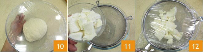 Transférez la pâte ainsi formée dans un bol, couvrez avec un film plastique 10 et laissez lever. Pour plus de commodité, vous pouvez placer le bol dans le four éteint mais avec la lumière allumée, de sorte que l'intérieur atteigne la température de 26-28°, idéale pour la levée; alternativement, vous pouvez également garder le bol dans un endroit chaud. Les temps sont approximatifs car chaque pâte, la température et les conditions météorologiques influencent la levée: en moyenne, la pâte devrait prendre 2 heures et 30 minutes pour doubler de volume. Pendant que la pâte lève, coupez le fiordilatte en 15 morceaux, d'environ 8 g chacun. Laissez égoutter la mozzarella dans une passoire recouverte de film plastique au réfrigérateur 11 12.