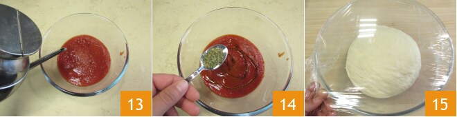 Après la période de levée, assaisonnez la purée de tomates avec de l'huile 13, du sel et de l'origan 14. Reprenez ensuite la pâte levée 15.