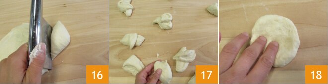 Coupez la pâte avec une corne 16 en 15 morceaux d'environ 50 g chacun 17. Aidez-vous avec de la farine et étalez la pâte avec vos doigts 18.