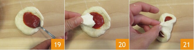Au centre, mettez une cuillère à café de purée de tomates 19, un morceau de mozzarella 20 et refermez la boule en ramenant les bords vers le centre 21.