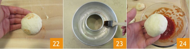 Vous aurez ainsi formé une bouchée farcie 22. Prenez un moule à beignet de 27,5 cm de diamètre et badigeonnez le fond et le bord avec de l'huile 23. Plongez la boule dans le bol de purée de tomates 24.