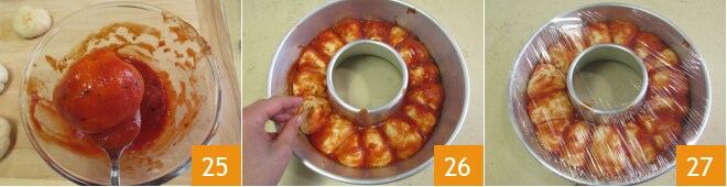 Assurez-vous que la boule soit enveloppée par la sauce 25, puis placez-la à l'intérieur du moule. Disposez les boules près les unes des autres 26. Couvrez avec du film plastique et laissez lever pendant environ 1 heure 27.