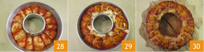 Après la période de levée 28, faites cuire dans un four déjà chaud à 190 degrés pendant environ 35 minutes. Une fois la cuisson terminée, laissez refroidir quelques minutes 29 puis démoulez votre beignet pizza haut et moelleux 30.