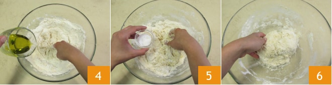 Versez ensuite l'huile 4, petit à petit. Quand vous aurez versé la moitié du liquide, vous pouvez ajouter aussi le sel 5 et pétrir 6 jusqu'à ce que la pâte soit lisse et homogène.