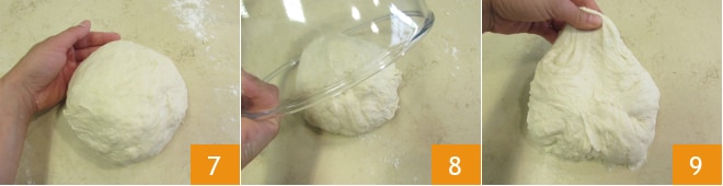 Une fois que vous avez obtenu une belle boule lisse 7, laissez-la reposer sur le plan de travail pendant une dizaine de minutes en la couvrant avec le bol 8. Après le repos, donnez-lui un petit pli: imaginez que la sphère est divisée en 4 parties, prenez l'extrémité de chacune, tirez-la délicatement et repliez-la vers le centre 9, enfin donnez-lui la forme d'une sphère.