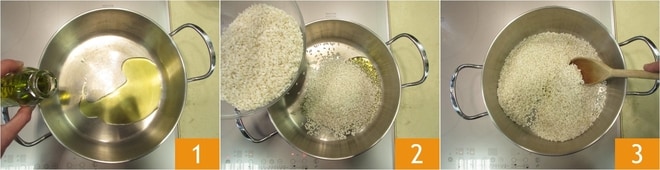 Pour préparer la couronne de riz farcie aux aubergines, commencez par réaliser le risotto. Versez un filet d'huile dans une casserole 1, ajoutez le riz 2 et faites-le griller pendant quelques minutes 3.