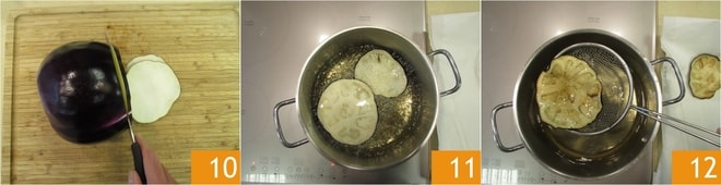Entre-temps, lavez l'aubergine, retirez les extrémités et coupez-la en tranches d'environ 5 mm d'épaisseur avec une mandoline 10. Versez l'huile de graines dans une poêle et chauffez-la jusqu'à atteindre une température de 170°. Ensuite, plongez quelques tranches d'aubergine 11 et faites-les cuire quelques minutes jusqu'à ce qu'elles soient bien dorées. Puis égouttez-les, transférez-les sur une feuille de papier absorbant 12 et continuez la cuisson des autres.