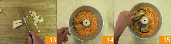 Coupez ensuite le caciocavallo en cubes 13 et réservez-le. À ce stade, huilez le fond d'un moule à couronne d'environ 9 cm de hauteur, de 20 cm de diamètre à la surface et de 23 cm à la base, puis tapissez-le de chapelure. De cette façon, vous n'aurez pas de difficulté à démouler la couronne. Versez environ la moitié du riz à l'intérieur 14, en tassant bien avec une cuillère. Ensuite, placez au centre du riz la moitié des aubergines frites 15,
