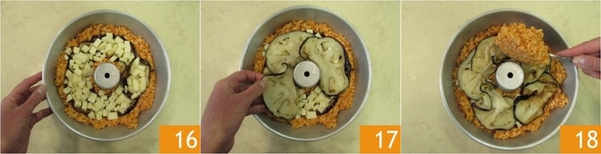 les cubes de caciocavallo 16 et les autres aubergines frites par-dessus 17. Couvrez le tout avec le reste du riz 18.