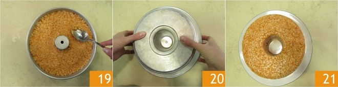 Tassez bien avec le dos de la cuillère 19. Faites cuire dans un four statique préchauffé à 200° pendant environ 25 minutes, puis sortez la couronne et laissez-la reposer pendant environ 15 minutes avant de la retourner sur un plat de service 20 21.