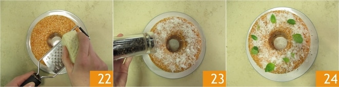 Garnissez la couronne de riz farcie aux aubergines en râpant 30 g de caciocavallo sur la surface 22, une pincée de poivre et les feuilles de basilic frais 24.
