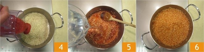Ajoutez ensuite la purée de tomates 4, salez, poivrez et ajoutez les premiers 300 grammes d'eau 5. Couvrez avec un couvercle et faites cuire pendant 25/30 minutes en remuant de temps en temps et en ajoutant de l'eau au besoin. À la fin de la cuisson, éteignez le feu 6.