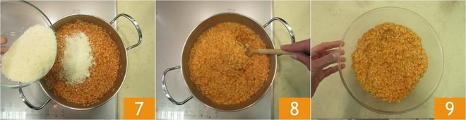 Assaisonnez le riz avec le Grana râpé 7, mélangez 8, puis versez le riz dans un bol et laissez refroidir à température ambiante pendant 1 heure 9.