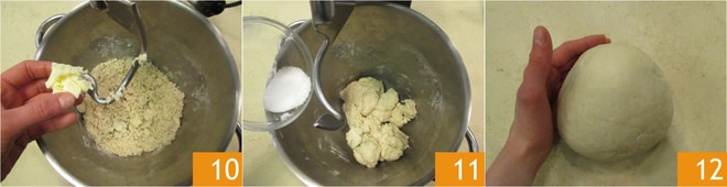 Pétrissez jusqu'à ce que les ingrédients soient amalgamés et ajoutez, peu à peu, le beurre 10. Une fois amalgamé, ajoutez le sel 11 et pétrissez jusqu'à absorption complète. Travaillez quelques secondes avec les mains, bouleversez pour former une boule ronde 12.