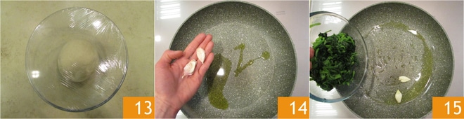 Déposez dans un bol et couvrez de film alimentaire 13. Laissez lever à environ 26°C pendant 1 heure. Pendant ce temps, chauffez l'huile dans une poêle, ajoutez les gousses d'ail 14 et ensuite les friarielli 15, faites sauter pendant quelques minutes.
