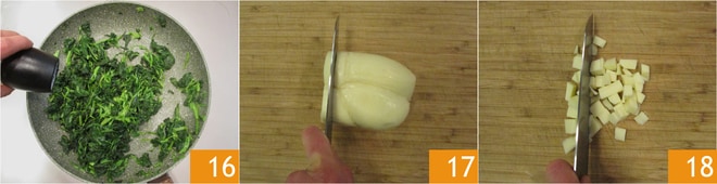 Salez et mettez de côté 16. Coupez la provola en lamelles 17 puis en petits dés 17, ensuite hachez-la 18.