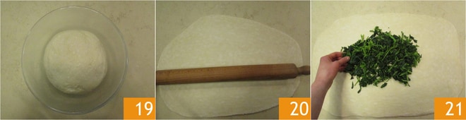 Reprenez la pâte levée 19, étalez-la à environ 4 mm d'épaisseur obtenant un rectangle d'environ 35 x 50 cm 20. Garnissez en couvrant toute la surface avec les friarielli 21.