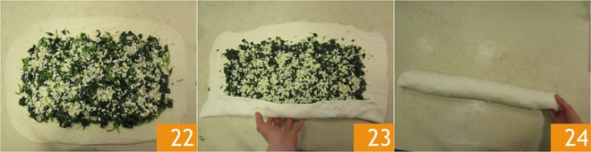 Ajoutez aussi la provola 22. Roulez en suivant le côté long 23, en faisant attention à ne pas faire sortir la garniture, scellez les bords 24 et mettez au réfrigérateur pour raffermir environ 30 minutes.