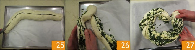 Déposez le rouleau sur une plaque recouverte de papier sulfurisé, faites une incision sur le côté long 25, en gardant une des extrémités intactes, entremêlez les deux extrémités, en les plaçant l'une sur l'autre et en gardant la garniture vers le haut 26. Une fois l'entrelacement terminé, formez une sorte de couronne en attachant les deux extrémités en pressant avec les doigts 27.