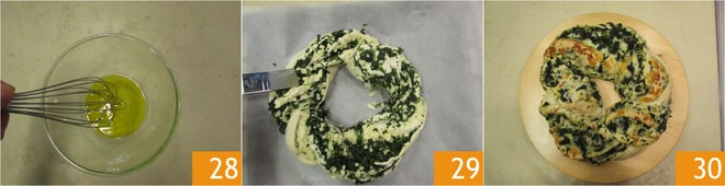 Faites une émulsion avec de l'eau et de l'huile 28. Badigeonnez-en la surface 29 et faites cuire dans un four préchauffé à 180°C statique pendant 60 minutes. Placez une plaque au-dessus de la couronne pour éviter que la résistance du four colore excessivement la surface, retirez-la ensuite 15 minutes avant la fin de la cuisson pour faire légèrement colorer la préparation. Sortez la couronne salée avec fromage et friarielli du four et servez-la tiède 30.